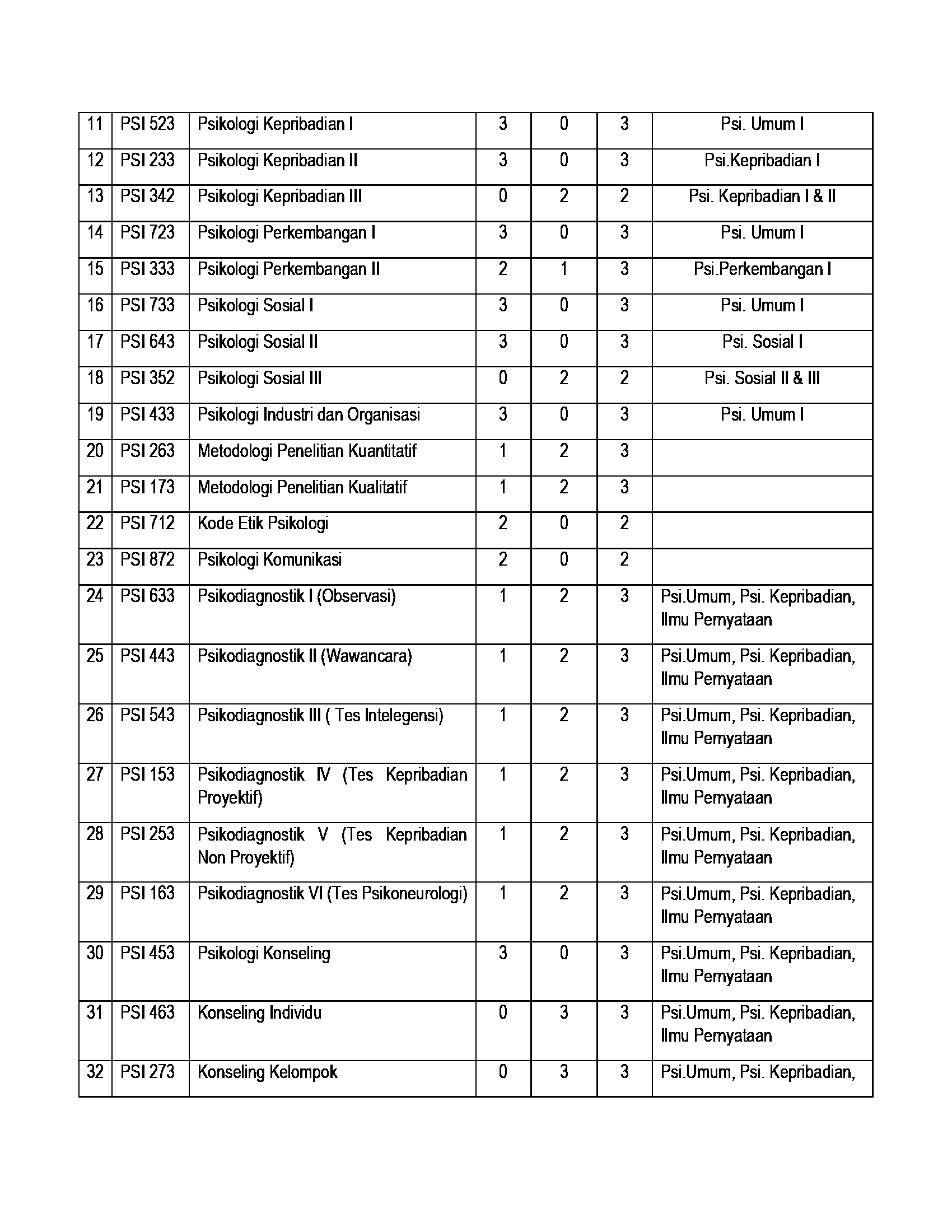 Beban studi pada Program Studi Psikologi Fak. Kedokteran Universitas Malikussaleh adalah 154 SKS, yang terbagi atas 106 sks teori (69%) dan 48 sks praktikum(31%). Untuk rincian sebaran/realisasi mata kuliah dapat dilihat pada Daftar Mata Kuliah.