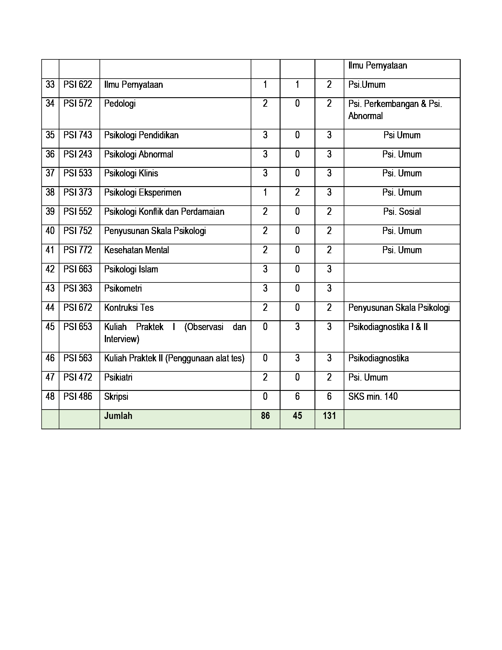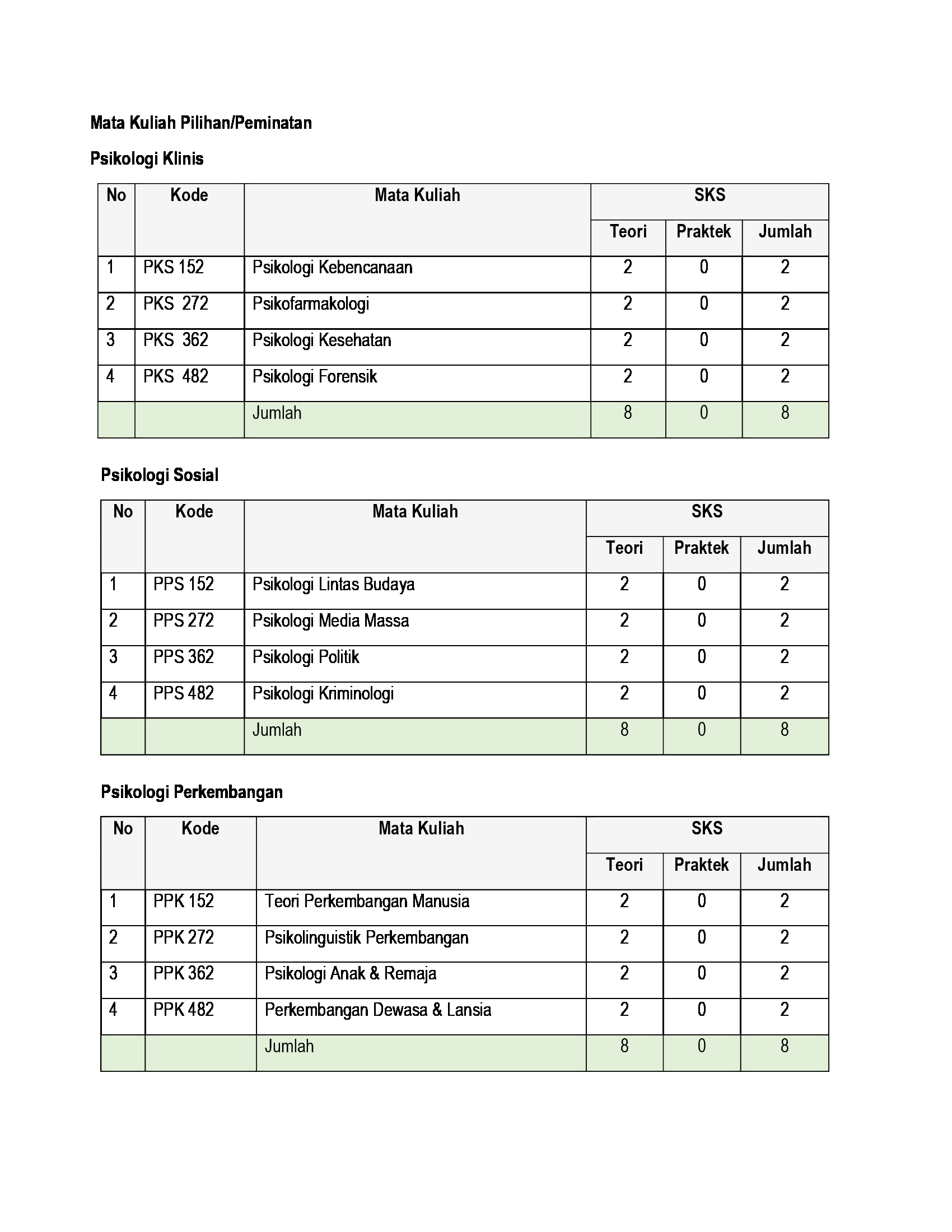 Kurikulum Program Studi Psikologi FK Unimal ditetapkan dan dikembangkan berdasarkan SNPT, KKNI dan AP2TPI yang diwujudkan dalam serangkaian mata kuliah dengan jenis mata kuliah yang terdiri atas tiga bagian, yaitu: